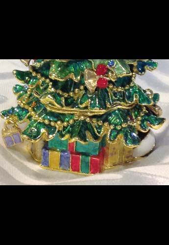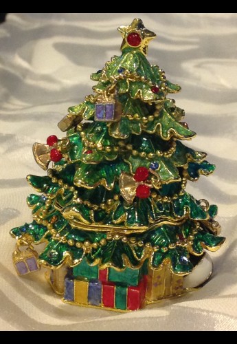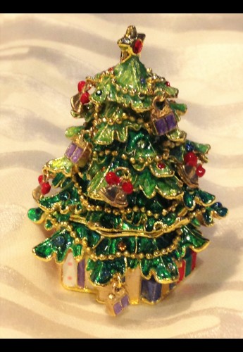 What lovely little Christmas tree box. Enameled pewter 3 inch tall tree box with hinged lid and Swarovski crystals